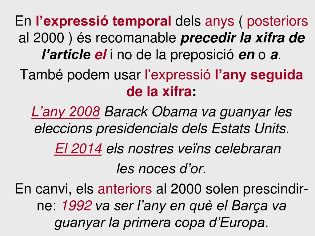 En l’expressió temporaldels anys ( posteriors al2000 ) és recomanable precedir la xifra de l’article eli no de la preposició en o a. També podem usar l’expressió l’any seguidade la xifra: L’any 2008 Barack Obama va guanyar les eleccions presidencials dels Estats Units. El 2014 els nostres veïns celebraran les noces d’or. En canvi, els anteriors al 2000 solen prescindir-ne: 1992 va ser l’any en què el Barça va guanyar la primera copa d’Europa.