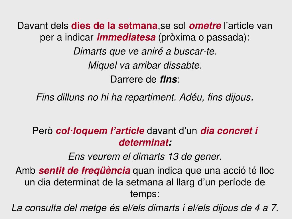 Davant dels dies de la setmana,se sol ometre l’article van per a indicar immediatesa (pròxima o passada): Dimarts que ve aniré a buscar-te. Miquel va arribar dissabte. Darrere de fins: Fins dilluns no hi ha repartiment. Adéu, fins dijous. Però col·loquem l’articledavant d’un dia concret i determinat: Ens veurem el dimarts 13 de gener. Amb sentit de freqüènciaquan indica que una acció té lloc un dia determinat de la setmana al llarg d’un període de temps: La consulta del metge és el/els dimarts i el/els dijous de 4 a 7.
