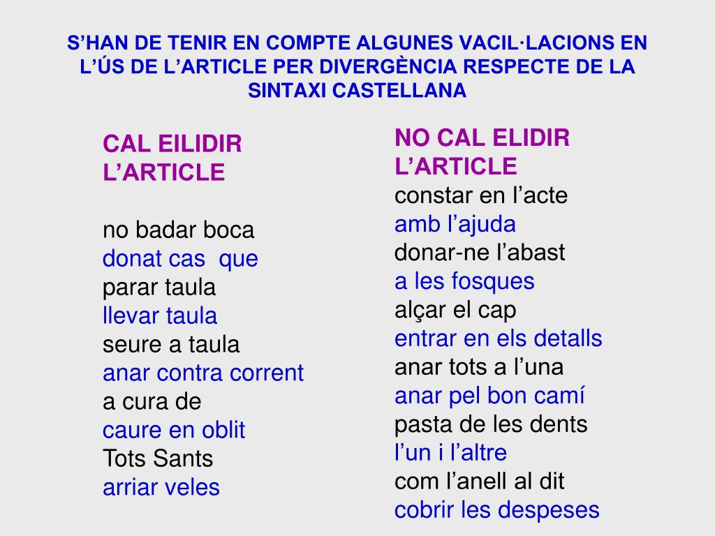 S’HAN DE TENIR EN COMPTE ALGUNES VACIL·LACIONS EN L’ÚS DE L’ARTICLE PER DIVERGÈNCIA RESPECTE DE LA SINTAXI CASTELLANA NO CAL ELIDIR L’ARTICLE constar en l’acte amb l’ajuda donar-ne l’abast a les fosques alçar el cap entrar en els detalls anar tots a l’una anar pel bon camí pasta de les dents l’un i l’altre com l’anell al dit cobrir les despeses CAL EILIDIR L’ARTICLE no badar boca donat cas que parar taula llevar taula seure a taula anar contra corrent a cura de caure en oblit Tots Sants arriar veles