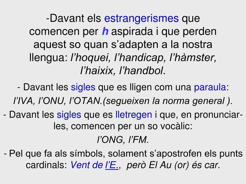 -Davant els estrangerismes que comencen per h aspirada i que perden aquest so quan s’adapten a la nostra llengua: l’hoquei, l’handicap, l’hàmster, l’haixix, l’handbol. - Davant les sigles que es lligen com una paraula: l’IVA, l’ONU, l’OTAN.(segueixen la norma general ). - Davant les sigles que es lletregen i que, en pronunciar-les, comencen per un so vocàlic: l’ONG, l’FM. - Pel que fa als símbols, solament s’apostrofen els punts cardinals: Vent de l’E., però El Au (or) és car.