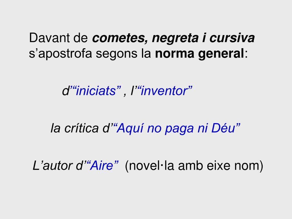 Davant de cometes, negreta i cursiva s’apostrofa segons la norma general: d’“iniciats” , l’“inventor” la crítica d’“Aquí no paga ni Déu” L’autor d’“Aire”(novel·la amb eixe nom)