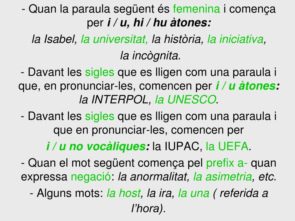 - Quan la paraula següent és femenina i comença per i / u, hi / hu àtones: la Isabel, la universitat, la història, la iniciativa, la incògnita. - Davant les sigles que es lligen com una paraula i que, en pronunciar-les, comencen per i / u àtones: la INTERPOL, la UNESCO. - Davant les sigles que es lligen com una paraula i que en pronunciar-les, comencen per i / u no vocàliques: la IUPAC, la UEFA. - Quan el mot següent comença pel prefix a- quan expressa negació: la anormalitat, la asimetria, etc. - Alguns mots: la host, la ira, la una ( referida a l’hora).