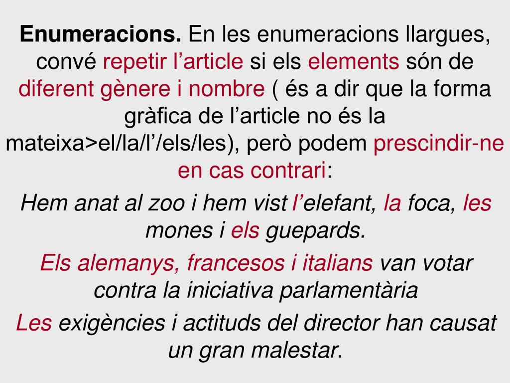 Enumeracions. En les enumeracions llargues, convé repetir l’article si els elements són de diferent gènere i nombre ( és a dir que la forma gràfica de l’article no és la mateixa>el/la/l’/els/les), però podem prescindir-ne en cas contrari: Hem anat al zoo i hem vist l’elefant, la foca, les mones i els guepards. Els alemanys, francesos i italians van votar contra la iniciativa parlamentària Les exigències i actituds del director han causat un gran malestar.