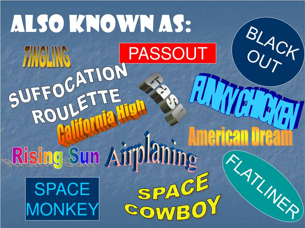 Also Known As: BLACK OUT PASSOUT TINGLING SUFFOCATION ROULETTE Gasp FUNKY CHICKEN California High American Dream Airplaning Rising Sun SPACE COWBOY FLATLINER SPACE MONKEY