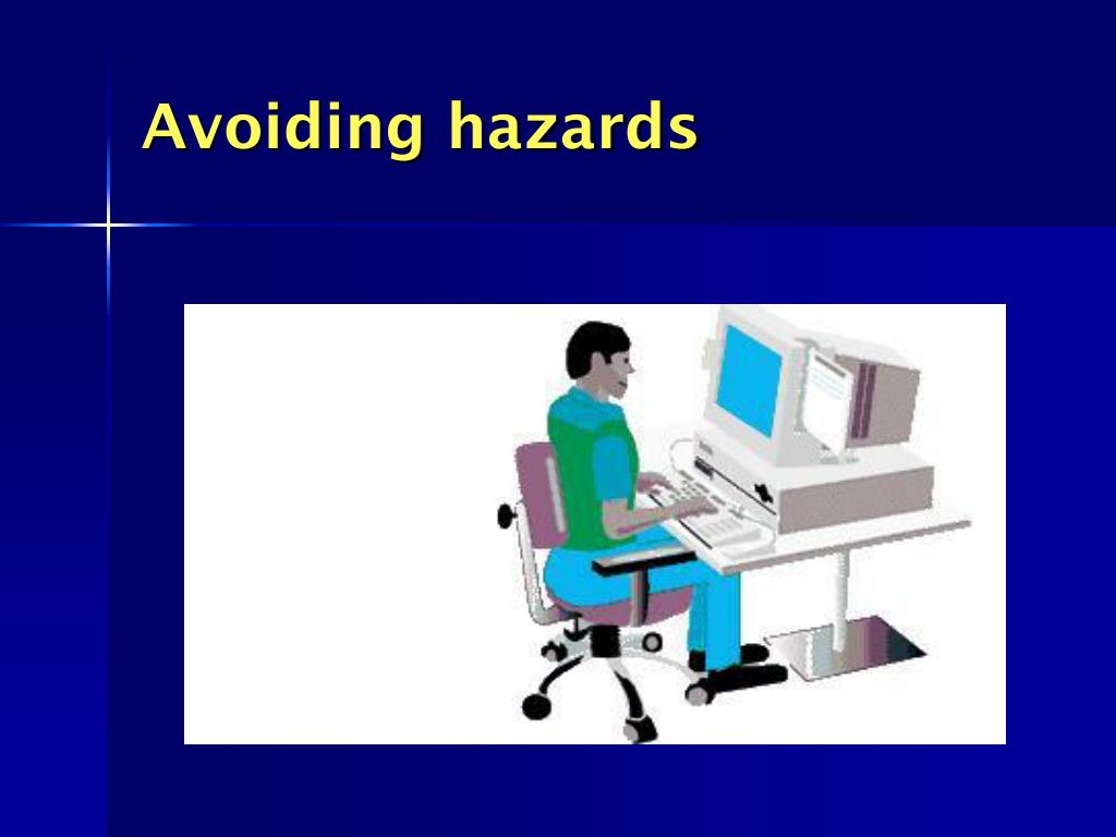Hazards in an ICT workplace • The main hazards to heath in an ICT workplace are: • Backache. • Eyestrain. • Headaches. • Repetitive Strain Injury. • Radiation.