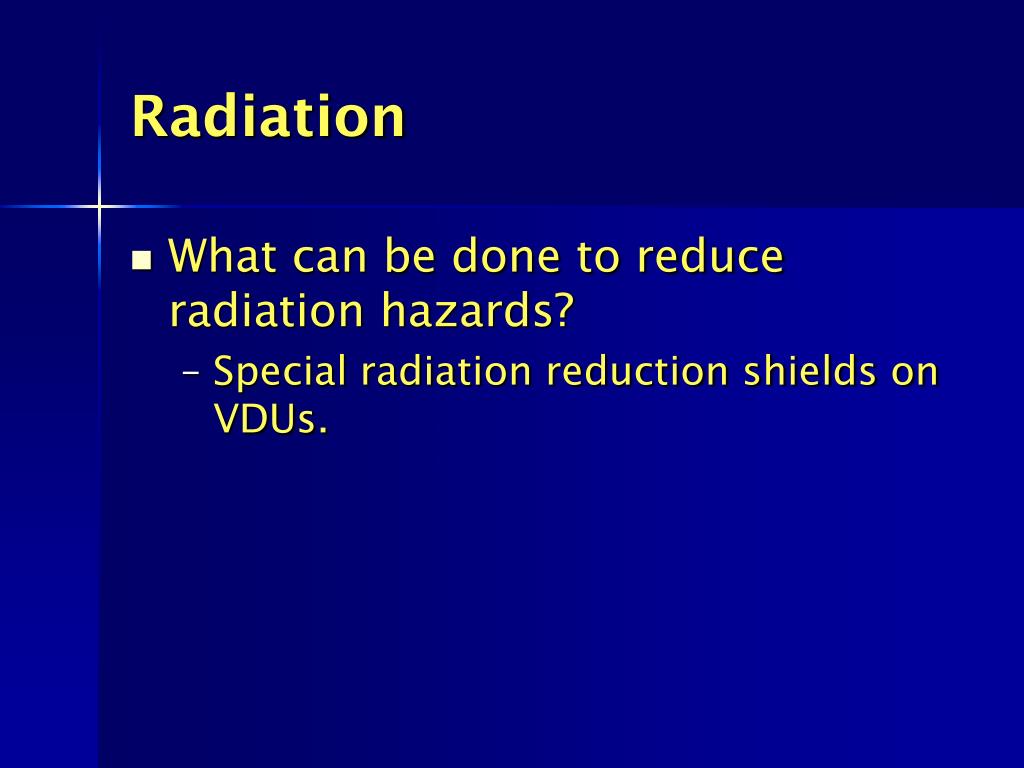 Radiation • What can be done to reduce radiation hazards? • Special radiation reduction shields on VDUs.