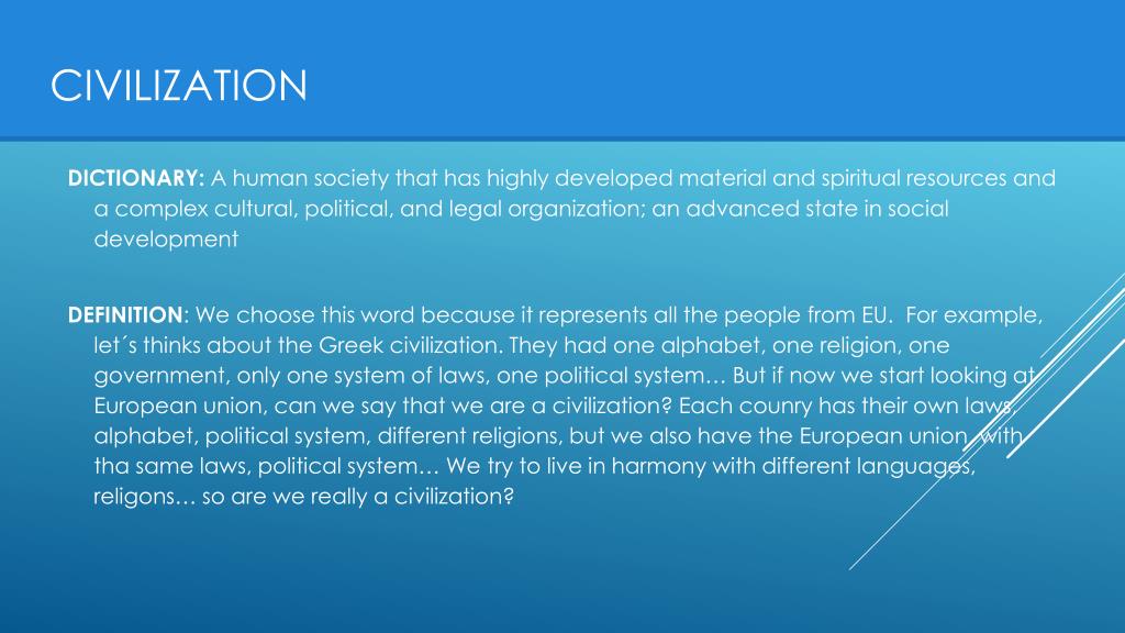 CIVILIZATION DICTIONARY: A human society that has highly developed material and spiritual resources and a complex cultural, political, and legal organization; an advanced state in social development DEFINITION: We choose this word because it represents all the people from EU. For example, let´s thinks about the Greek civilization. They had one alphabet, one religion, one government, only one system of laws, one political system… But if now we start looking at European union, can we say that we are a civilization? Each counry has their own laws, alphabet, political system, different religions, but we also have the European union, with tha same laws, political system… We try to live in harmony with different languages, religons… so arewe really a civilization?