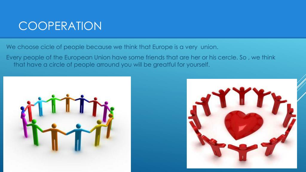 Cooperation We choose cicle of people because we think that Europe is a very union. Every people of the European Union have some friends that are her or his cercle. So , we think that have a circle of people arround you will be greatful for yourself.