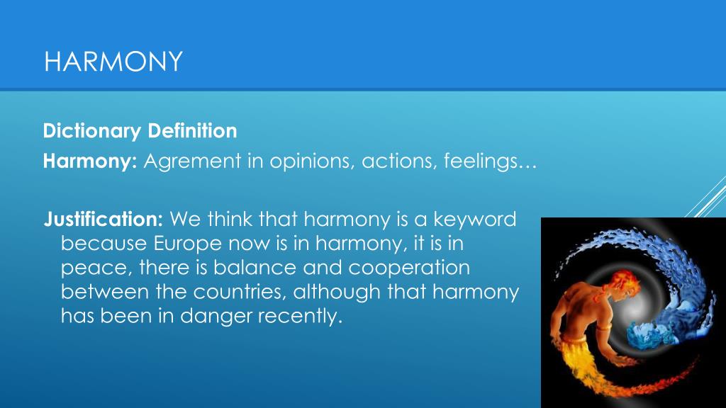 Harmony Dictionary Definition Harmony: Agrement in opinions, actions, feelings… Justification: We think that harmony is a keyword because Europe now is in harmony, it is in peace, there is balance and cooperation between the countries, although that harmony has been in danger recently.