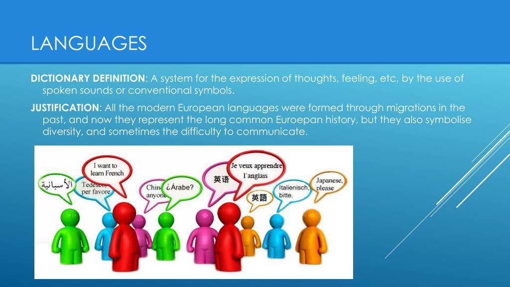 LANGUAGES DICTIONARY DEFINITION: A system for the expression of thoughts, feeling, etc, by the use of spoken sounds or conventional symbols. JUSTIFICATION: All the modern European languages were formed through migrations in the past, and now they represent the long common Euroepan history, but they also symbolise diversity, and sometimes the difficulty to communicate.