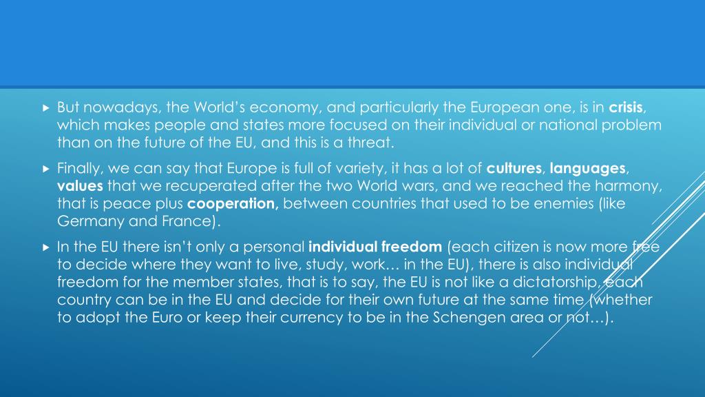 But nowadays, the World’s economy, and particularly the European one, is in crisis, which makes people and states more focused on their individual or national problem than on the future of the EU, and this is a threat. Finally, we can say that Europe is full of variety, it has a lot of cultures, languages, values that we recuperated after the two World wars, and we reached the harmony, that is peace plus cooperation, between countries that used to be enemies (like Germany and France). In the EU there isn’t only a personal individual freedom (each citizen is now more free to decide where they want to live, study, work… in the EU), there is also individual freedom for the member states, that is to say, the EU is not like a dictatorship, each country can be in the EU and decide for their own future at the same time (whether to adopt the Euro or keep their currency to be in the Schengen area or not…).