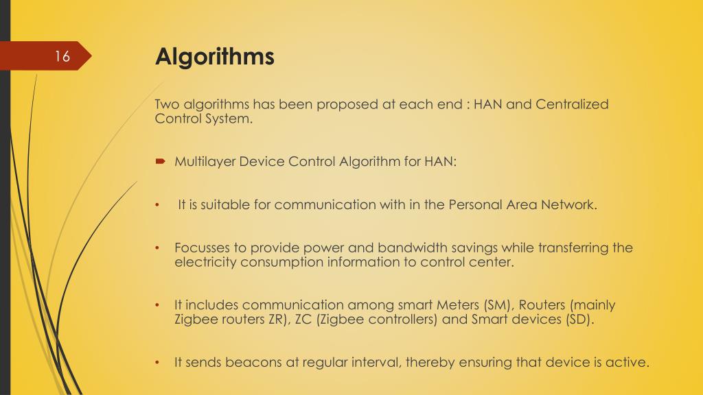 Algorithms Two algorithms has been proposed at each end : HAN and Centralized Control System. • Multilayer Device Control Algorithm for HAN: • It is suitable for communication with in the Personal Area Network. • Focusses to provide power and bandwidth savings while transferring the electricity consumption information to control center. • It includes communication among smart Meters (SM), Routers (mainly Zigbee routers ZR), ZC (Zigbee controllers) and Smart devices (SD). • It sends beacons at regular interval, thereby ensuring that device is active.