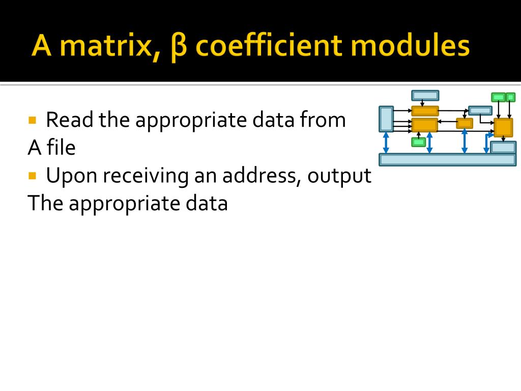 A matrix, β coefficient modules • Read the appropriate data from A file • Upon receiving an address, output The appropriate data