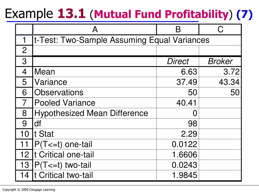 Example 13.1 (Mutual Fund Profitability) (6) Click Data, Data Analysis, t-Test: Two-Sample Assuming Equal Variances