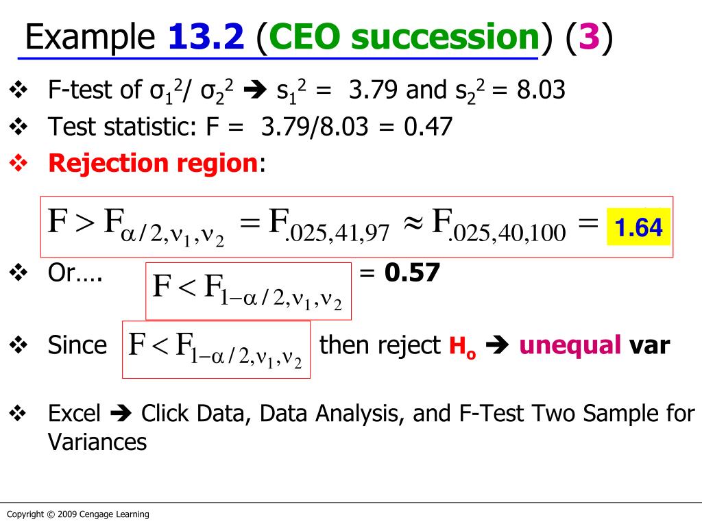 Example 13.2 (CEO succession) (3) • F-test of σ12/ σ22 s12 = 3.79 and s22 = 8.03 • Test statistic: F = 3.79/8.03 = 0.47 • Rejection region: • Or…. = 0.57 • Since then reject Hounequal var • Excel Click Data, Data Analysis, and F-Test Two Sample for Variances 1.64