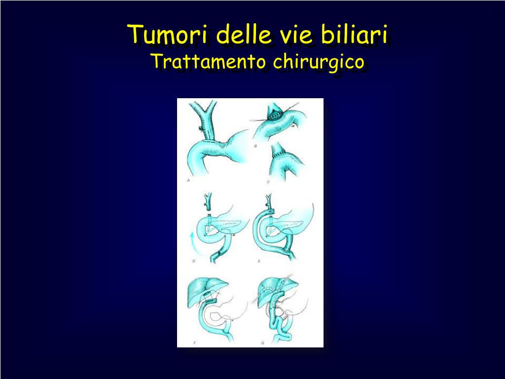 Tumori delle vie biliariNeoplasia della colecisti • Trattamento chirurgico • T1 (limitato allo strato muscolare): sufficiente la colecistectomia (reperto occasionale!) • T2 (invasione del connettivo perimuscolare): colecistectomia allargata al IV e V segmento e linfoadenectomia • T3 e T4 (interessamento della sierosa e del fegato): interventi palliativi