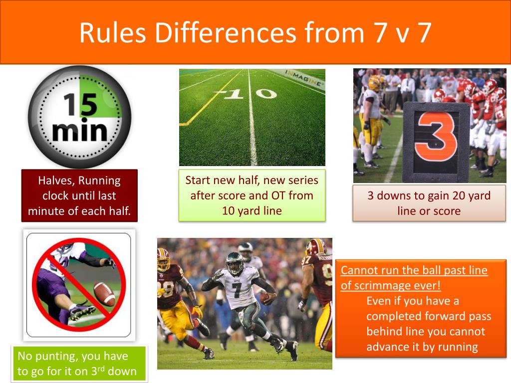 Rules Differences from 7 v 7 Start new half, new series after score and OT from 10 yard line Halves, Running clock until last minute of each half. 3 downs to gain 20 yard line or score • Cannot run the ball past line of scrimmage ever! • Even if you have a completed forward pass behind line you cannot advance it by running No punting, you have to go for it on 3rd down