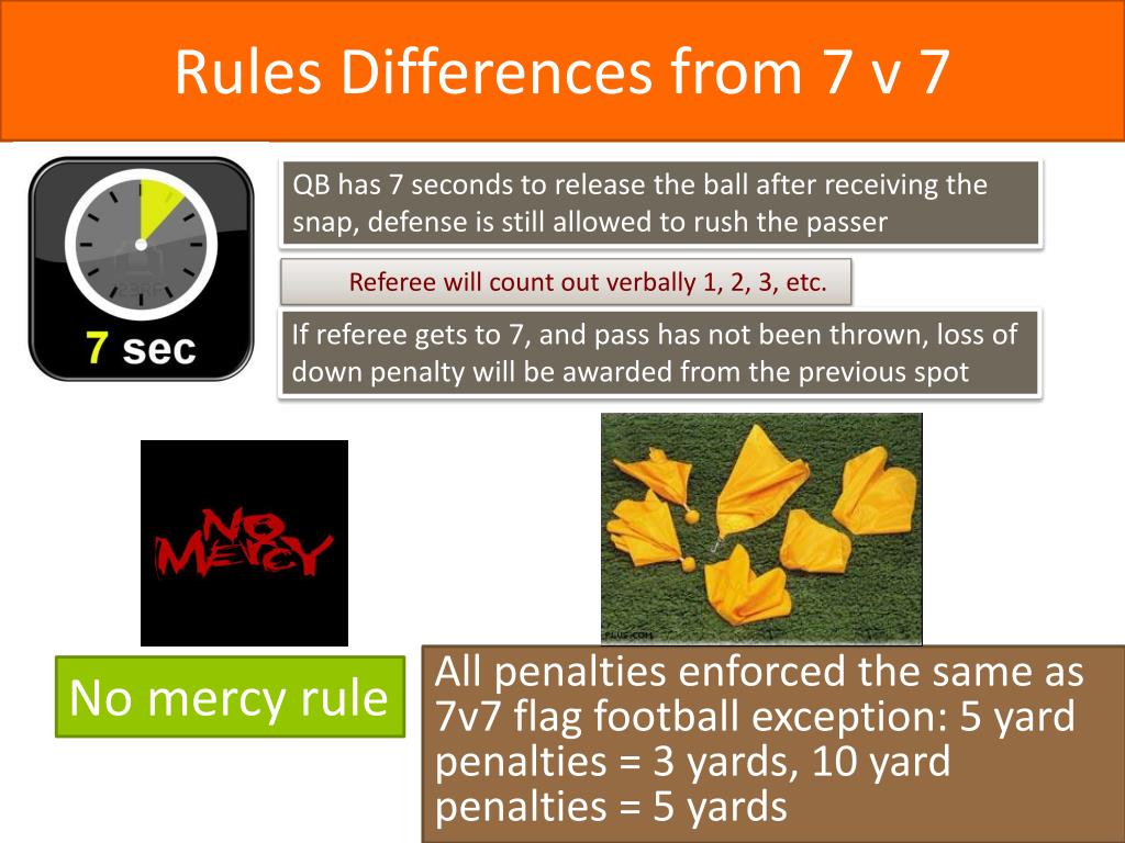 Rules Differences from 7 v 7 QB has 7 seconds to release the ball after receiving the snap, defense is still allowed to rush the passer All penalties enforced the same as 7v7 flag football exception: 5 yard penalties = 3 yards, 10 yard penalties = 5 yards • Referee will count out verbally 1, 2, 3, etc. If referee gets to 7, and pass has not been thrown, loss of down penalty will be awarded from the previous spot No mercy rule