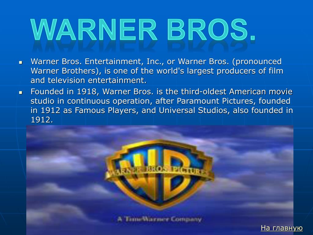 Warner Bros. Warner Bros. Entertainment, Inc., or Warner Bros. (pronounced Warner Brothers), is one of the world's largest producers of film and television entertainment. Founded in 1918, Warner Bros. is the third-oldest American movie studio in continuous operation, after Paramount Pictures, founded in 1912 as Famous Players, and Universal Studios, also founded in 1912. На главную