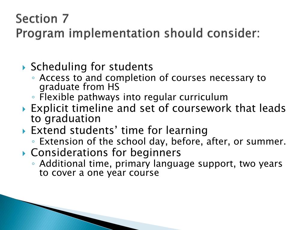 Section 7Program implementation should consider: • Scheduling for students • Access to and completion of courses necessary to graduate from HS • Flexible pathways into regular curriculum • Explicit timeline and set of coursework that leads to graduation • Extend students’ time for learning • Extension of the school day, before, after, or summer. • Considerations for beginners • Additional time, primary language support, two years to cover a one year course