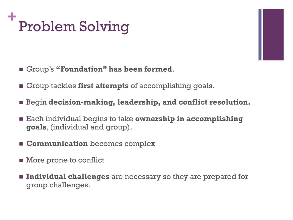 Problem Solving • Group’s “Foundation” has been formed. • Group tackles first attempts of accomplishing goals. • Begin decision-making, leadership, and conflict resolution. • Each individual begins to take ownership in accomplishing goals, (individual and group). • Communication becomes complex • More prone to conflict • Individual challenges are necessary so they are prepared for group challenges.