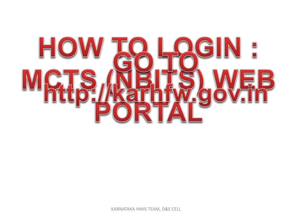 HOW TO LOGIN : MCTS (NBITS) WEB PORTAL GO TO http://karhfw.gov.in KARNATAKA HMIS TEAM, D&E CELL