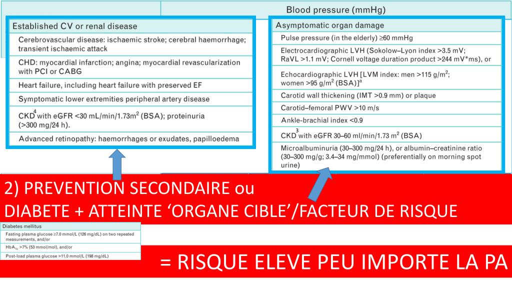 4 3 2) PREVENTION SECONDAIRE ou DIABETE + ATTEINTE ‘ORGANE CIBLE’/FACTEUR DE RISQUE = RISQUE ELEVE PEU IMPORTE LA PA