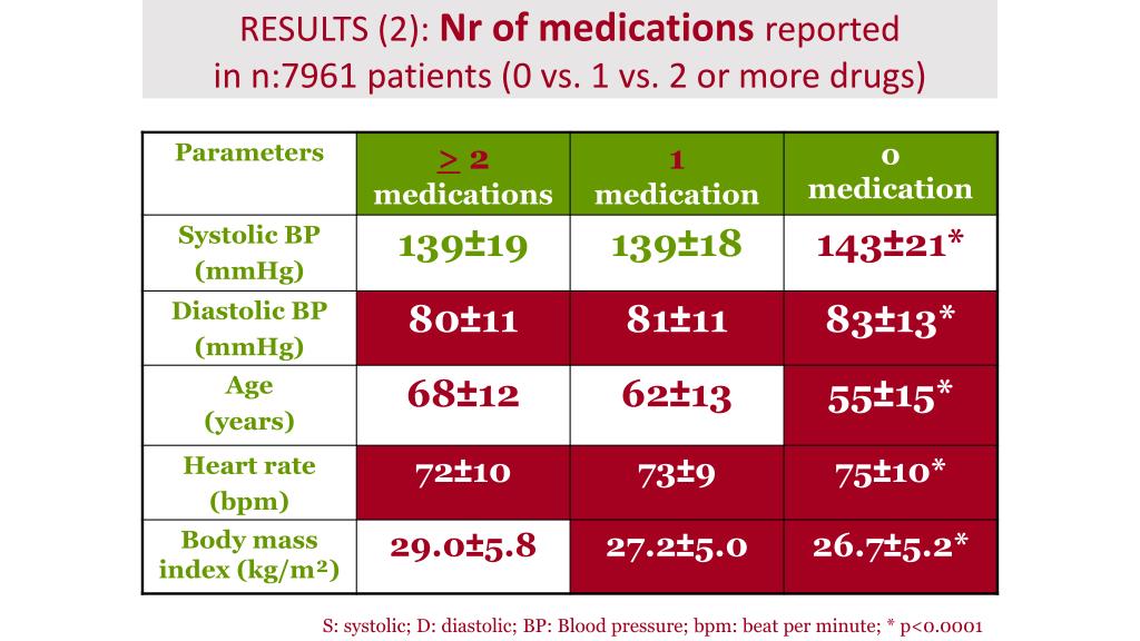 RESULTS (2): Nr of medications reported in n:7961 patients (0 vs. 1 vs. 2 or more drugs) S: systolic; D: diastolic; BP: Blood pressure; bpm: beat per minute; * p<0.0001