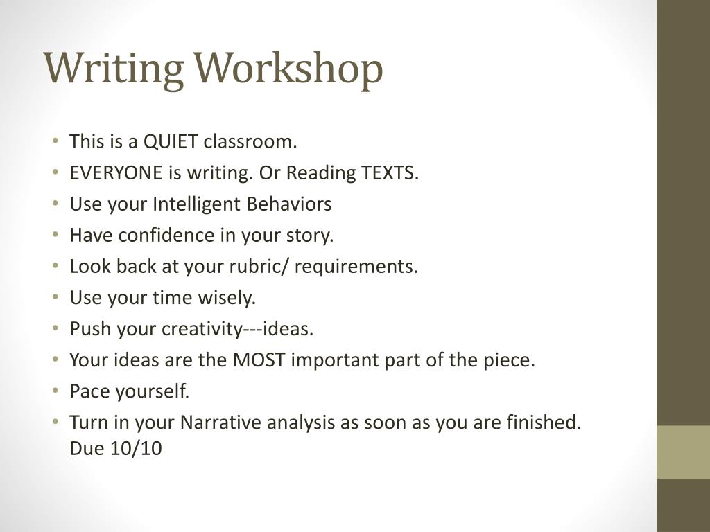 Writing Workshop • This is a QUIET classroom. • EVERYONE is writing. Or Reading TEXTS. • Use your Intelligent Behaviors • Have confidence in your story. • Look back at your rubric/ requirements. • Use your time wisely. • Push your creativity---ideas. • Your ideas are the MOST important part of the piece. • Pace yourself. • Turn in your Narrative analysis as soon as you are finished. Due 10/10