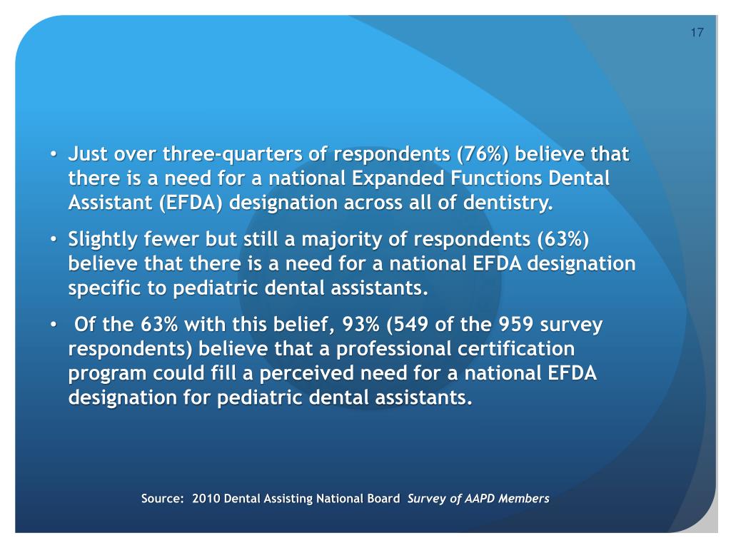 Just over three-quarters of respondents (76%) believe that there is a need for a national Expanded Functions Dental Assistant (EFDA) designation across all of dentistry. • Slightly fewer but still a majority of respondents (63%) believe that there is a need for a national EFDA designation specific to pediatric dental assistants. • Of the 63% with this belief, 93% (549 of the 959 survey respondents) believe that a professional certification program could fill a perceived need for a national EFDA designation for pediatric dental assistants. Source: 2010 Dental Assisting National Board Survey of AAPD Members