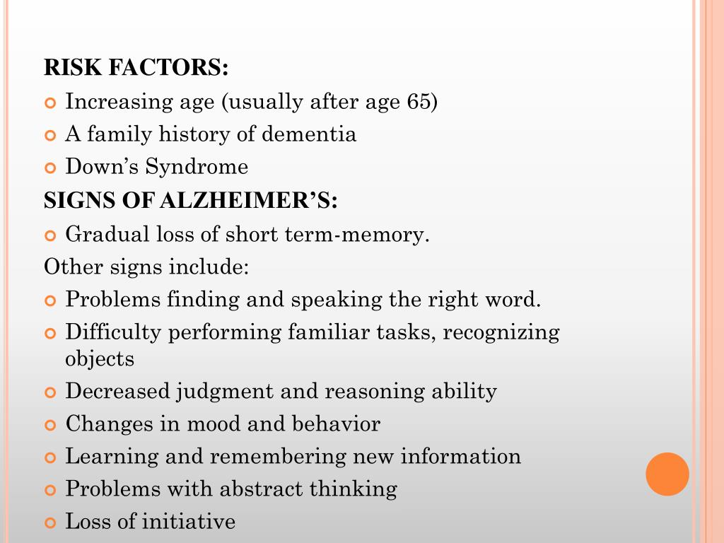 RISK FACTORS: • Increasing age (usually after age 65) • A family history of dementia • Down’s Syndrome SIGNS OF ALZHEIMER’S: • Gradual loss of short term-memory. Other signs include: • Problems finding and speaking the right word. • Difficulty performing familiar tasks, recognizing objects • Decreased judgment and reasoning ability • Changes in mood and behavior • Learning and remembering new information • Problems with abstract thinking • Loss of initiative