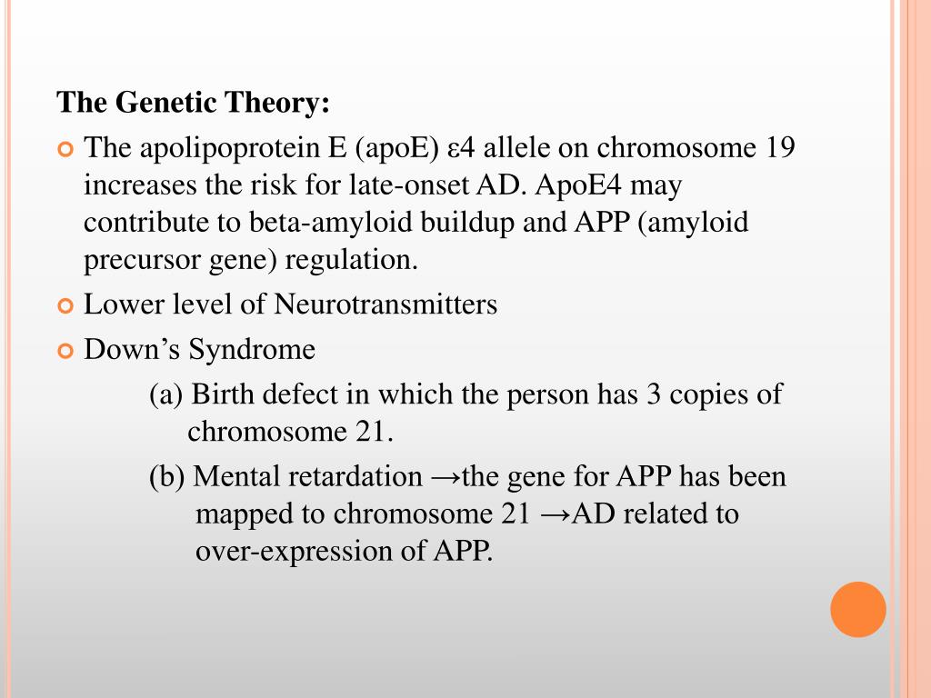 The Genetic Theory: • The apolipoprotein E (apoE) ε4 allele on chromosome 19 increases the risk for late-onset AD. ApoE4 may contribute to beta-amyloid buildup and APP (amyloid precursor gene) regulation. • Lower level of Neurotransmitters • Down’s Syndrome (a) Birth defect in which the person has 3 copies of chromosome 21. (b) Mental retardation →the gene for APP has been mapped to chromosome 21 →AD related to over-expression of APP.