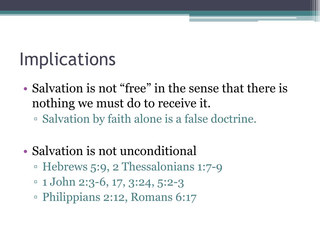 Implications • Salvation is not “free” in the sense that there is nothing we must do to receive it. • Salvation by faith alone is a false doctrine. • Salvation is not unconditional • Hebrews 5:9, 2 Thessalonians 1:7-9 • 1 John 2:3-6, 17, 3:24, 5:2-3 • Philippians 2:12, Romans 6:17