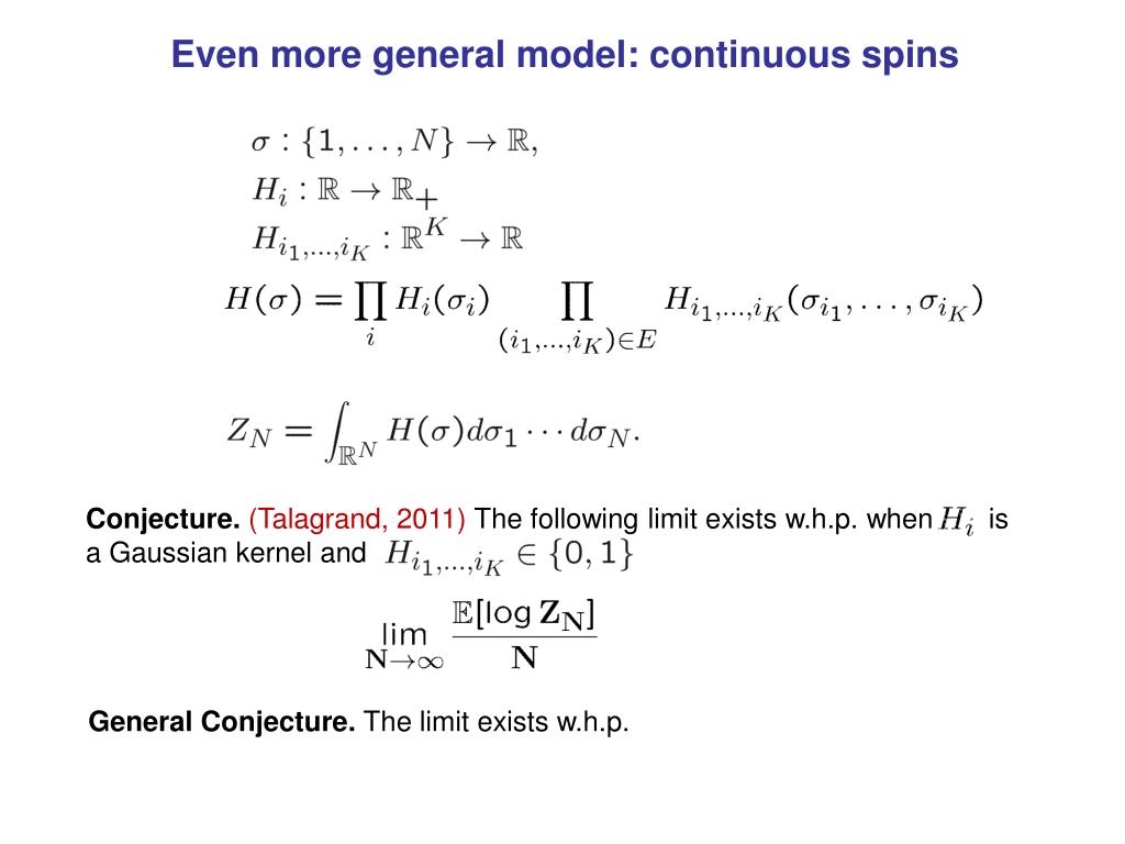 Even more general model: continuous spins Conjecture. (Talagrand, 2011) The following limit exists w.h.p. when is a Gaussian kernel and General Conjecture. The limit exists w.h.p.