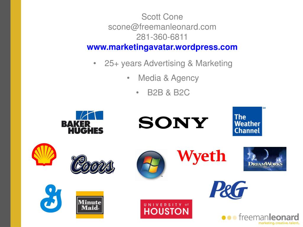 Scott Conescone@freemanleonard.com281-360-6811www.marketingavatar.wordpress.com • 25+ years Advertising & Marketing • Media & Agency • B2B & B2C
