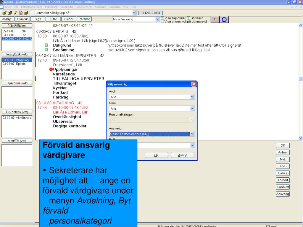 Förvald ansvarig vårdgivare • Sekreterare har möjlighet att ange en förvald vårdgivare under menyn Avdelning, Byt förvald personalkategori