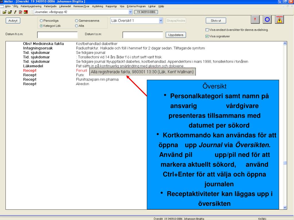 ÖversikthPersonalkategori samt namn på ansvarig vårdgivare presenteras tillsammans med datumet per sökordhKortkommando kan användas för att öppna upp Journal via Översikten. Använd pil upp/pil ned för att markera aktuellt sökord, använd Ctrl+Enter för att välja och öppna journalenhReceptaktiviteter kan läggas upp i översikten Det viktiga här