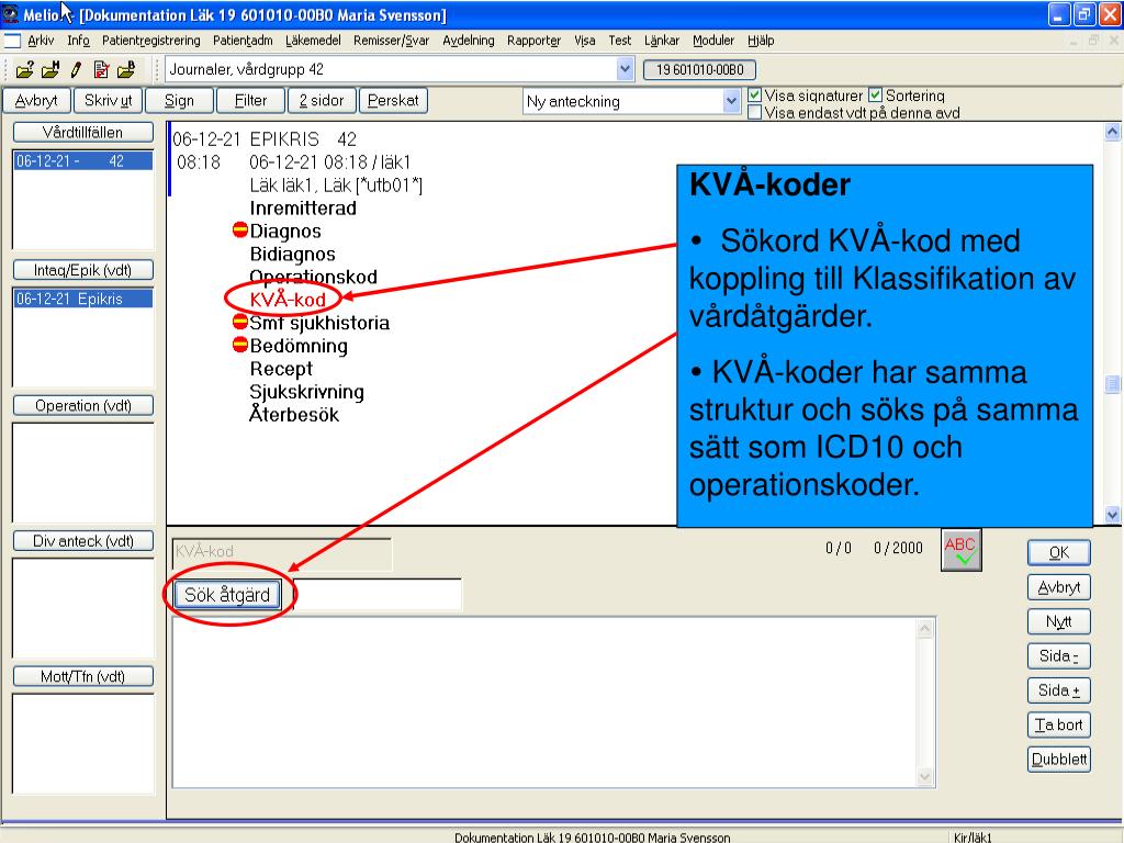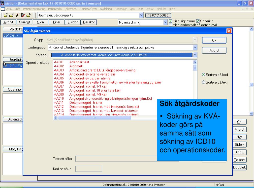 KVÅ-koder • Sökord KVÅ-kod med koppling till Klassifikation av vårdåtgärder. • KVÅ-koder har samma struktur och söks på samma sätt som ICD10 och operationskoder.