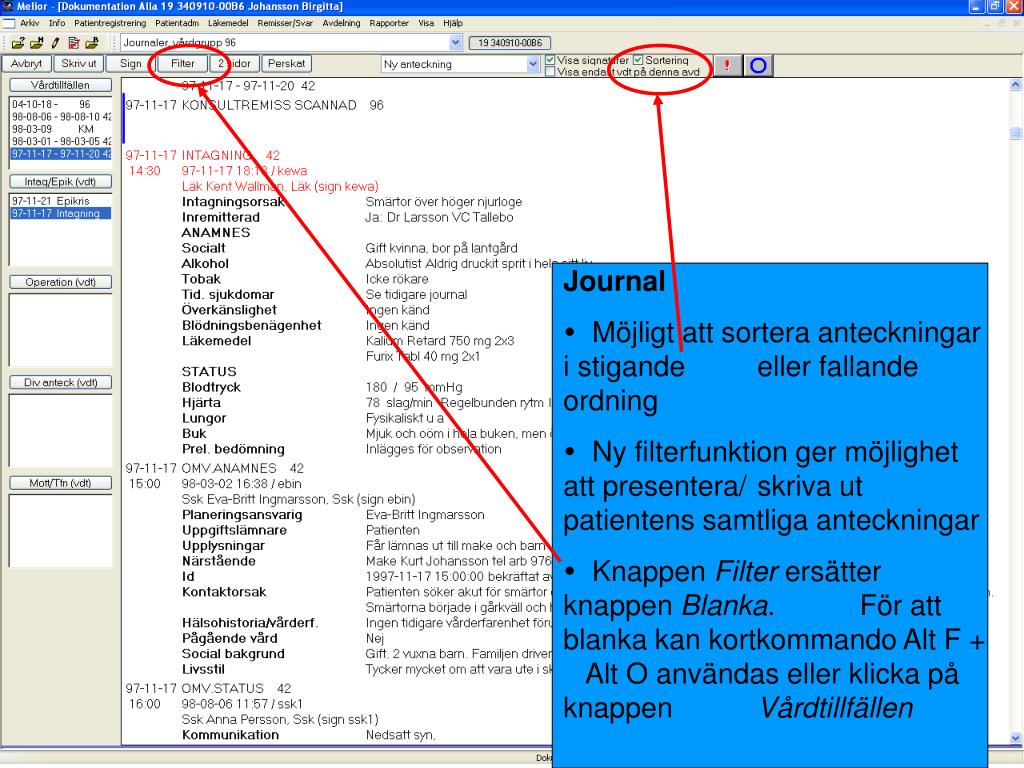 Journal • Möjligt att sortera anteckningar i stigande eller fallande ordning • Ny filterfunktion ger möjlighet att presentera/ skriva ut patientens samtliga anteckningar • Knappen Filter ersätter knappen Blanka. För att blanka kan kortkommando Alt F + Alt O användas eller klicka på knappen Vårdtillfällen