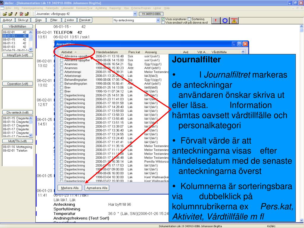 Journalfilter • I Journalfiltret markeras de anteckningar användaren önskar skriva ut eller läsa. Information hämtas oavsett vårdtillfälle och personalkategori • Förvalt värde är att anteckningarna visas efter händelsedatum med de senaste anteckningarna överst • Kolumnerna är sorteringsbara via dubbelklick på kolumnrubrikerna ex Pers.kat, Aktivitet, Vårdtillfälle m fl