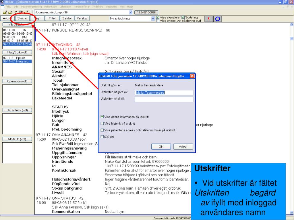 Utskrifter • Vid utskrifter är fältet Utskriften begärd av ifyllt med inloggad användares namn