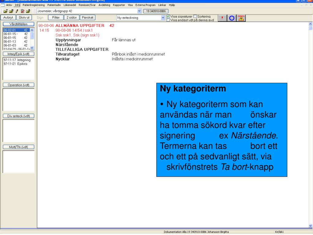 Ny kategoriterm • Ny kategoriterm som kan användas när man önskar ha tomma sökord kvar efter signering ex Närstående. Termerna kan tas bort ett och ett på sedvanligt sätt, via skrivfönstrets Ta bort-knapp