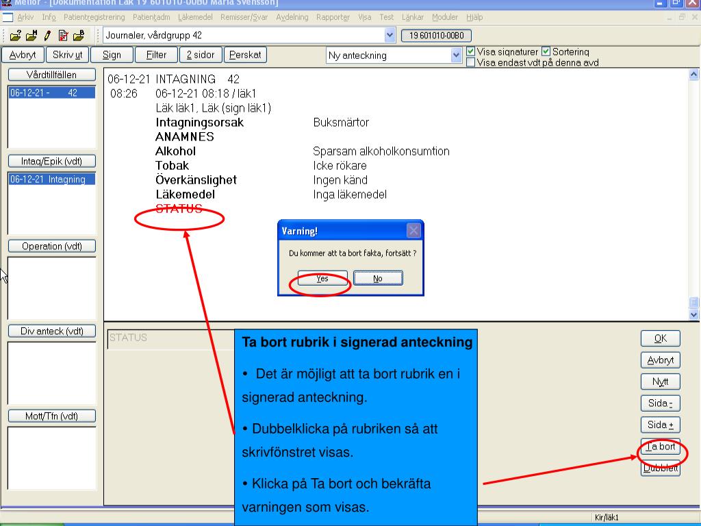 Ta bort rubrik i signerad anteckning • Det är möjligt att ta bort rubrik en i signerad anteckning. • Dubbelklicka på rubriken så att skrivfönstret visas. • Klicka på Ta bort och bekräfta varningen som visas.