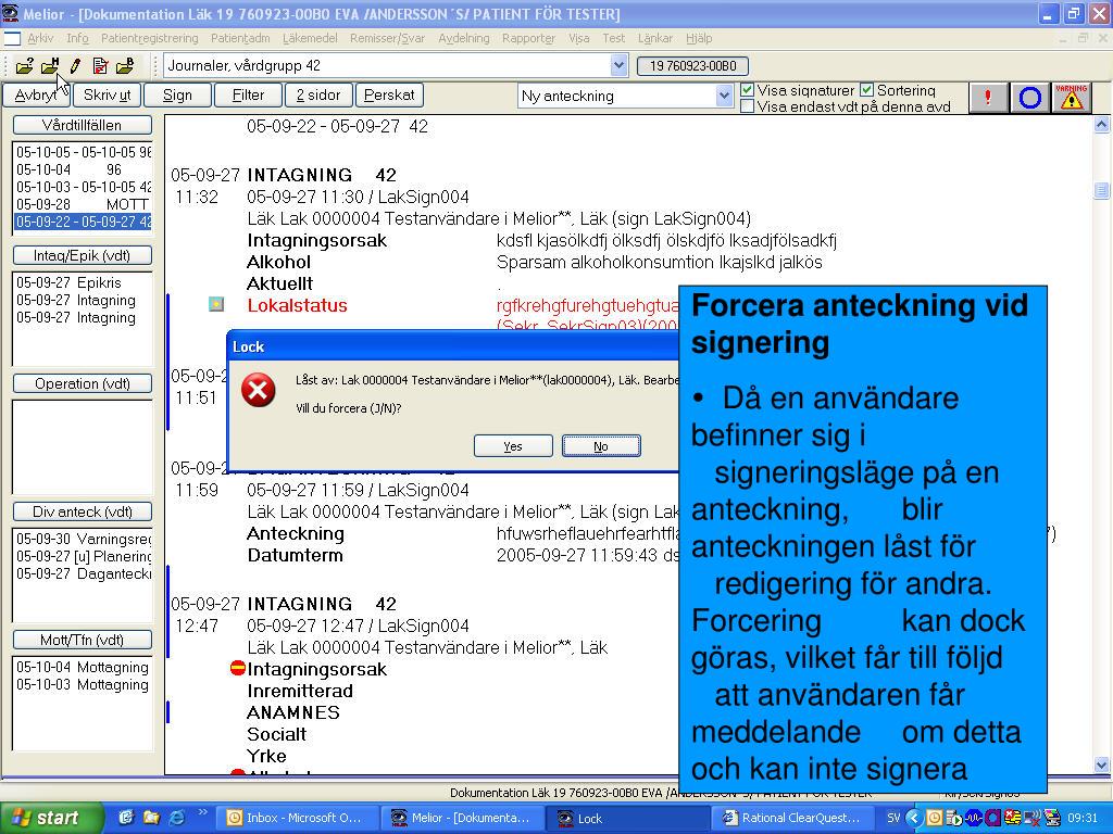 Forcera anteckning vid signering • Då en användare befinner sig i signeringsläge på en anteckning, blir anteckningen låst för redigering för andra. Forcering kan dock göras, vilket får till följd att användaren får meddelande om detta och kan inte signera