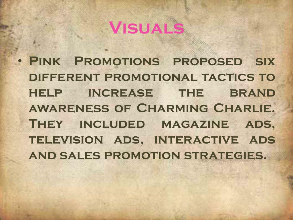 Visuals • Pink Promotions proposed six different promotional tactics to help increase the brand awareness of Charming Charlie. They included magazine ads, television ads, interactive ads and sales promotion strategies.
