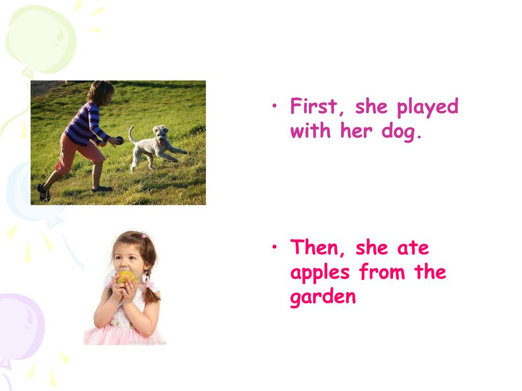 First, she played with her dog. • Then, she ate apples from the garden