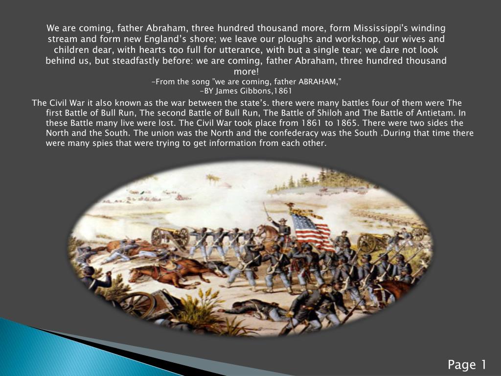 We are coming, father Abraham, three hundred thousand more, form Mississippi's winding stream and form new England’s shore; we leave our ploughs and workshop, our wives and children dear, with hearts too full for utterance, with but a single tear; we dare not look behind us, but steadfastly before: we are coming, father Abraham, three hundred thousand more! • From the song ”we are coming, father ABRAHAM,” • BY James Gibbons,1861 The Civil War it also known as the war between the state’s. there were many battles four of them were The first Battle of Bull Run, The second Battle of Bull Run, The Battle of Shiloh and The Battle of Antietam. In these Battle many live were lost. The Civil War took place from 1861 to 1865. There were two sides the North and the South. The union was the North and the confederacy was the South .During that time there were many spies that were trying to get information from each other. Page 1