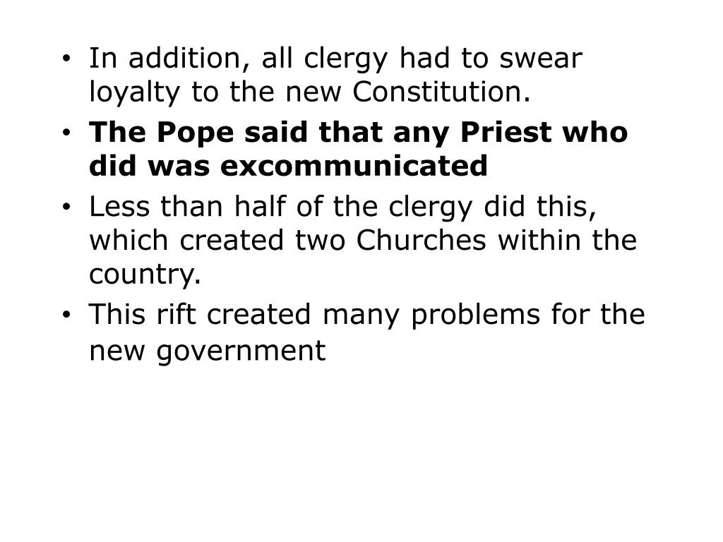In addition, all clergy had to swear loyalty to the new Constitution. • The Pope said that any Priest who did was excommunicated • Less than half of the clergy did this, which created two Churches within the country. • This rift created many problems for the new government