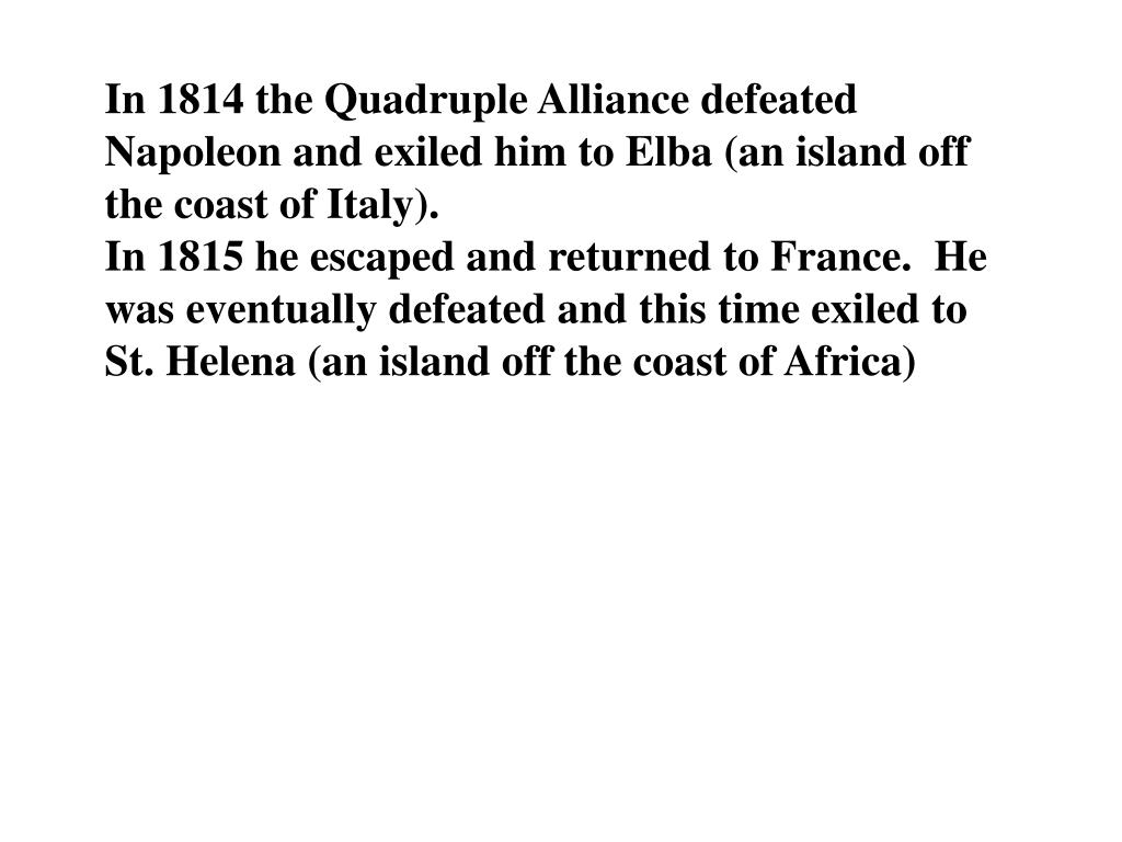 In 1814 the Quadruple Alliance defeated Napoleon and exiled him to Elba (an island off the coast of Italy). In 1815 he escaped and returned to France. He was eventually defeated and this time exiled to St. Helena (an island off the coast of Africa)