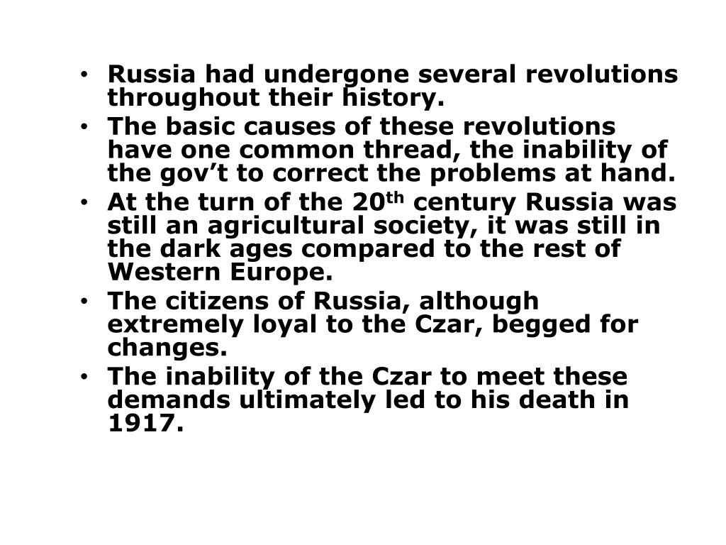 Russia had undergone several revolutions throughout their history. • The basic causes of these revolutions have one common thread, the inability of the gov’t to correct the problems at hand. • At the turn of the 20th century Russia was still an agricultural society, it was still in the dark ages compared to the rest of Western Europe. • The citizens of Russia, although extremely loyal to the Czar, begged for changes. • The inability of the Czar to meet these demands ultimately led to his death in 1917.